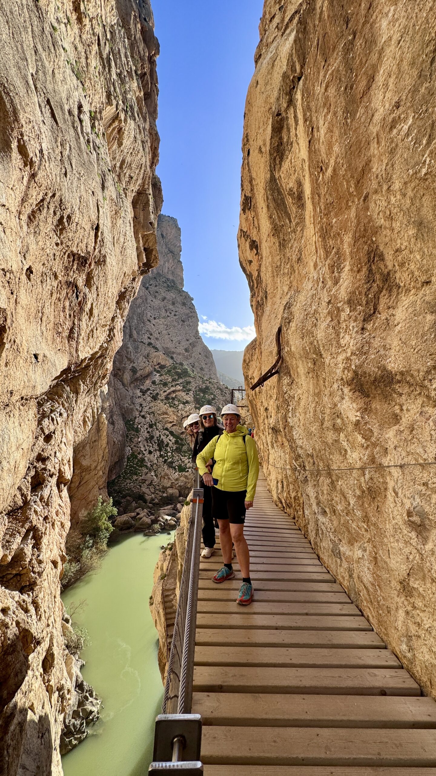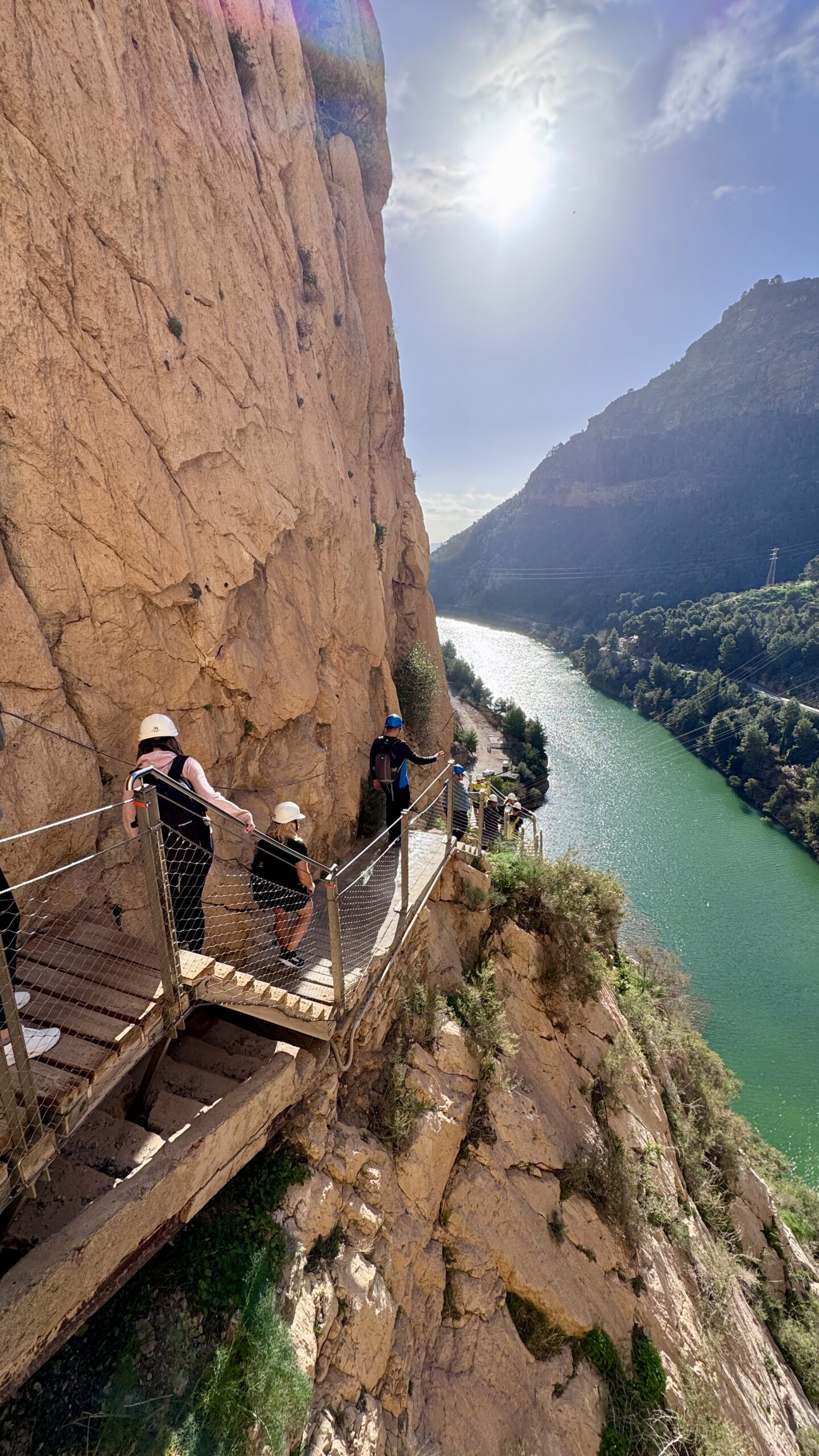 I midten av januar bestemte vi oss for å gå denne vakre Caminito del Rey-turen. Vi hadde fått tips om at det lønnet seg å bestille en av de tidligste avgangene for å ikke måtte gå i kø, så det var tidlig opp, med privatbuss fra Torremolinos. Vår buss hadde adgang til området innenfor den offentlige parkeringsplassen, så vi ble kjørt helt til starten av fotturen. Den startet med en lang, flott tunnel for fotgjengere. På den andre siden av tunnelen gikk vi ca. 1 km før vi kom til inngangen for turen, der måtte vi vise billetter og fikk utlevert hjelmer. Her er det også siste mulighet for å benytte toalett underveis på turen.