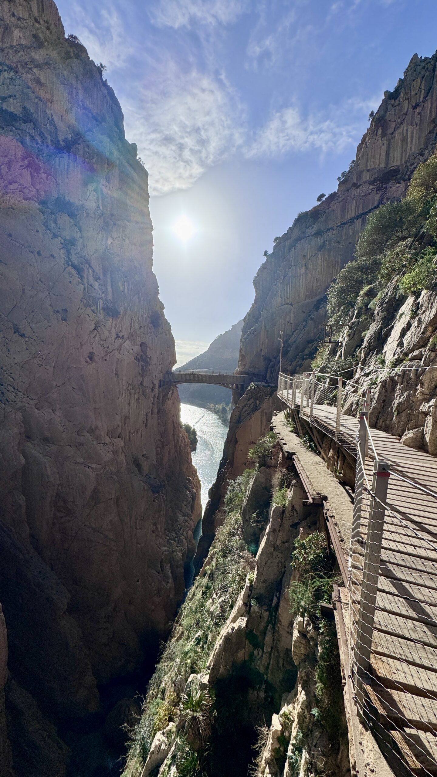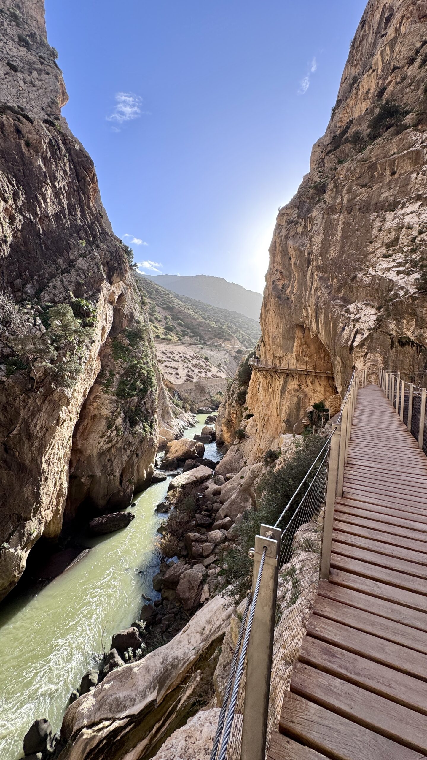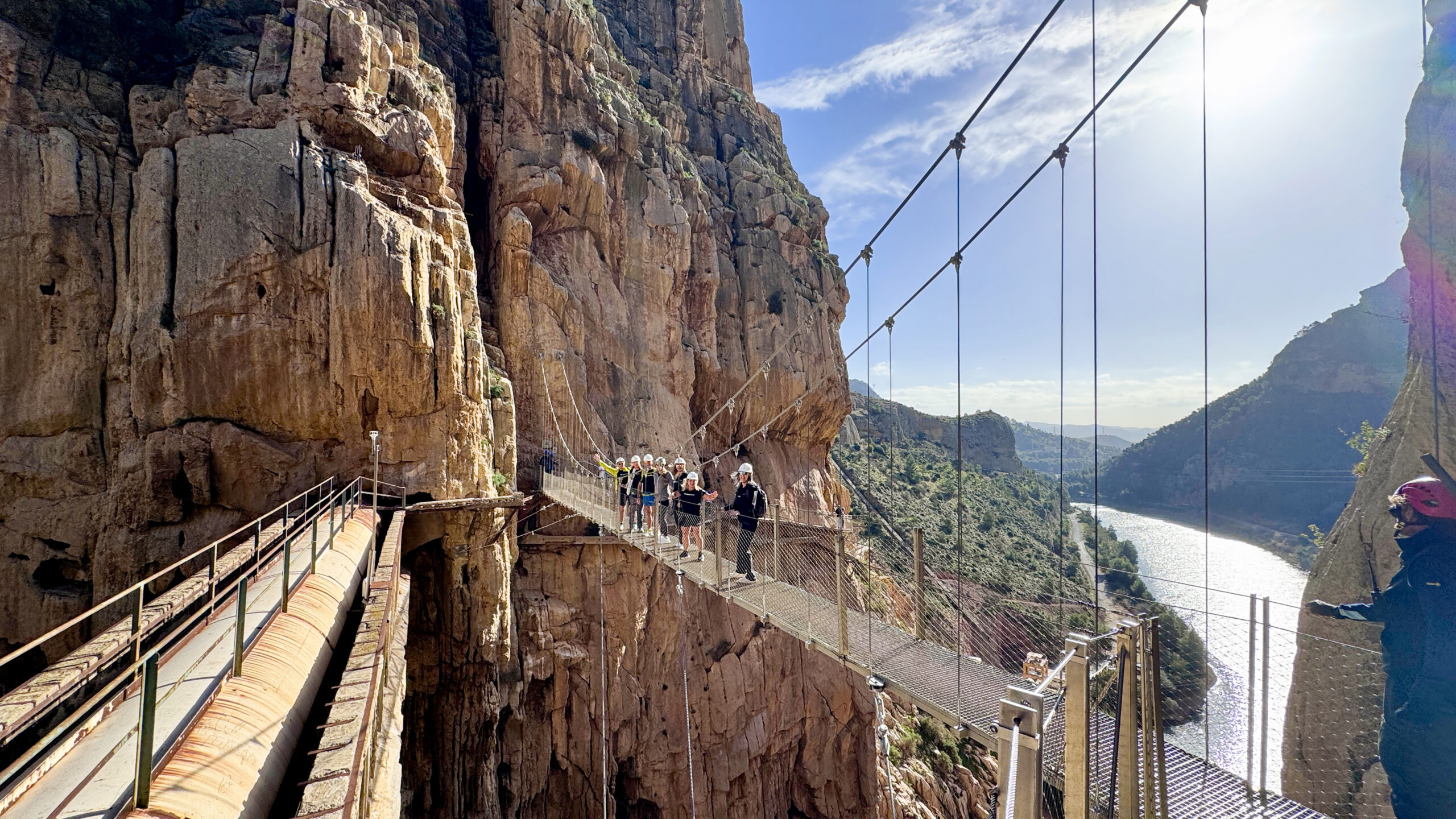 Rundt den absolutt siste svingen på turen, er det et utkikkspunkt med glassbunn. Kodak-moment, igjen. Og fra dette punktet kunne vi se turens absolutte høydepunkt: den 105 meter lange hengebroen, hengende ca. 100 meter over Guadalhorce-elven. Kul bakgrunn på bildene! Vel fremme med broen ble vi sendt over gruppe for gruppe, slik at det til en hver tid kun er det antall mennesker som er lov å benytte broen samtidig. Husk å se begge veier når du går over, du får en spektakulær utsikt over juvet og elven nedenfor. Kilte greit i magen på turen over.