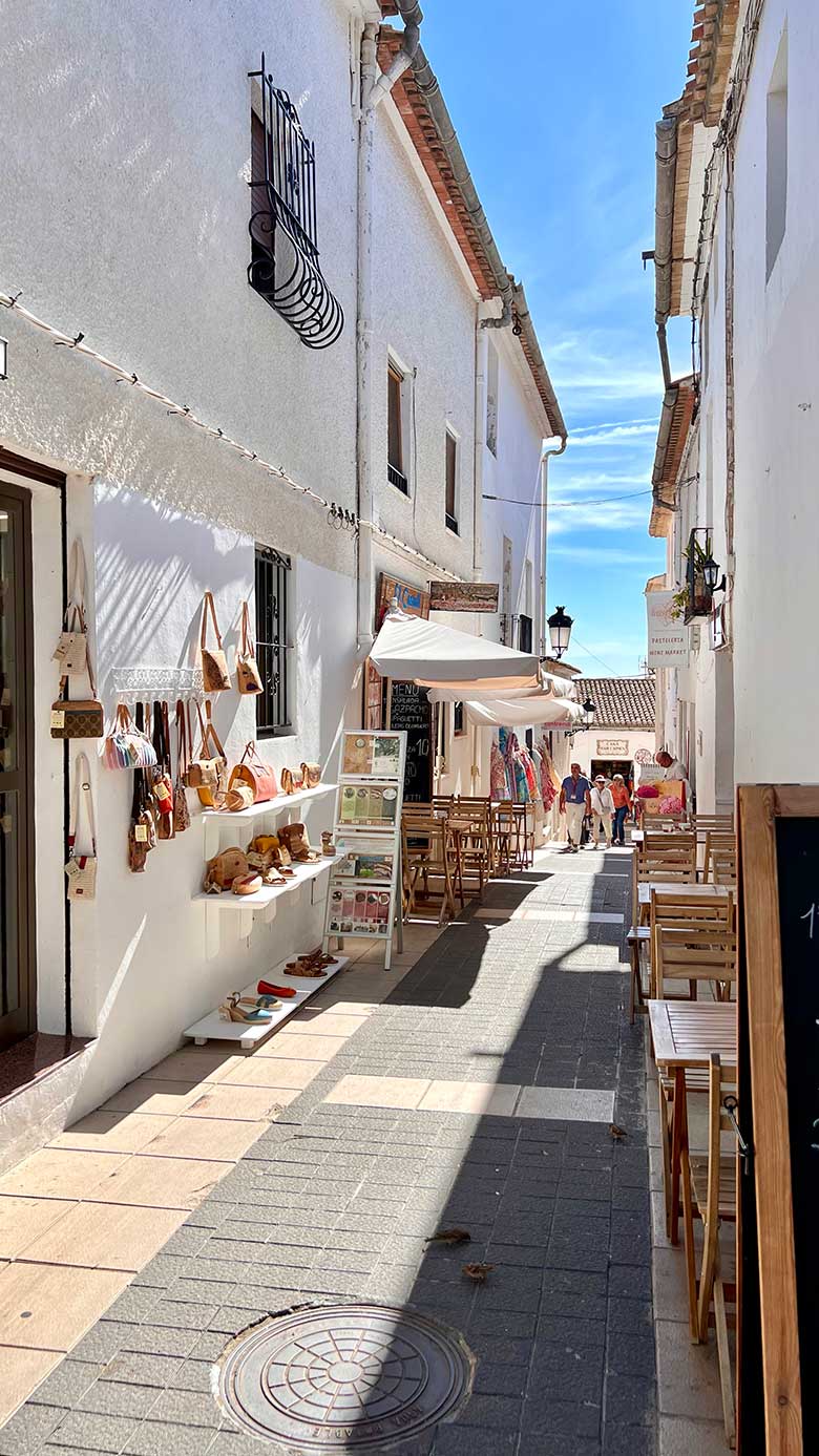 Det første som møter deg ved inngangen til Guadalest er de smale, brosteinbelagte smågatene i gamlebyen rundt borgen. Her tilbys lokalt håndtverk, honning, suvenirer, klær og vesker. Masse vesker. Og noen av dem kjøpte vi også med oss hjem, helt grei kvalitet.