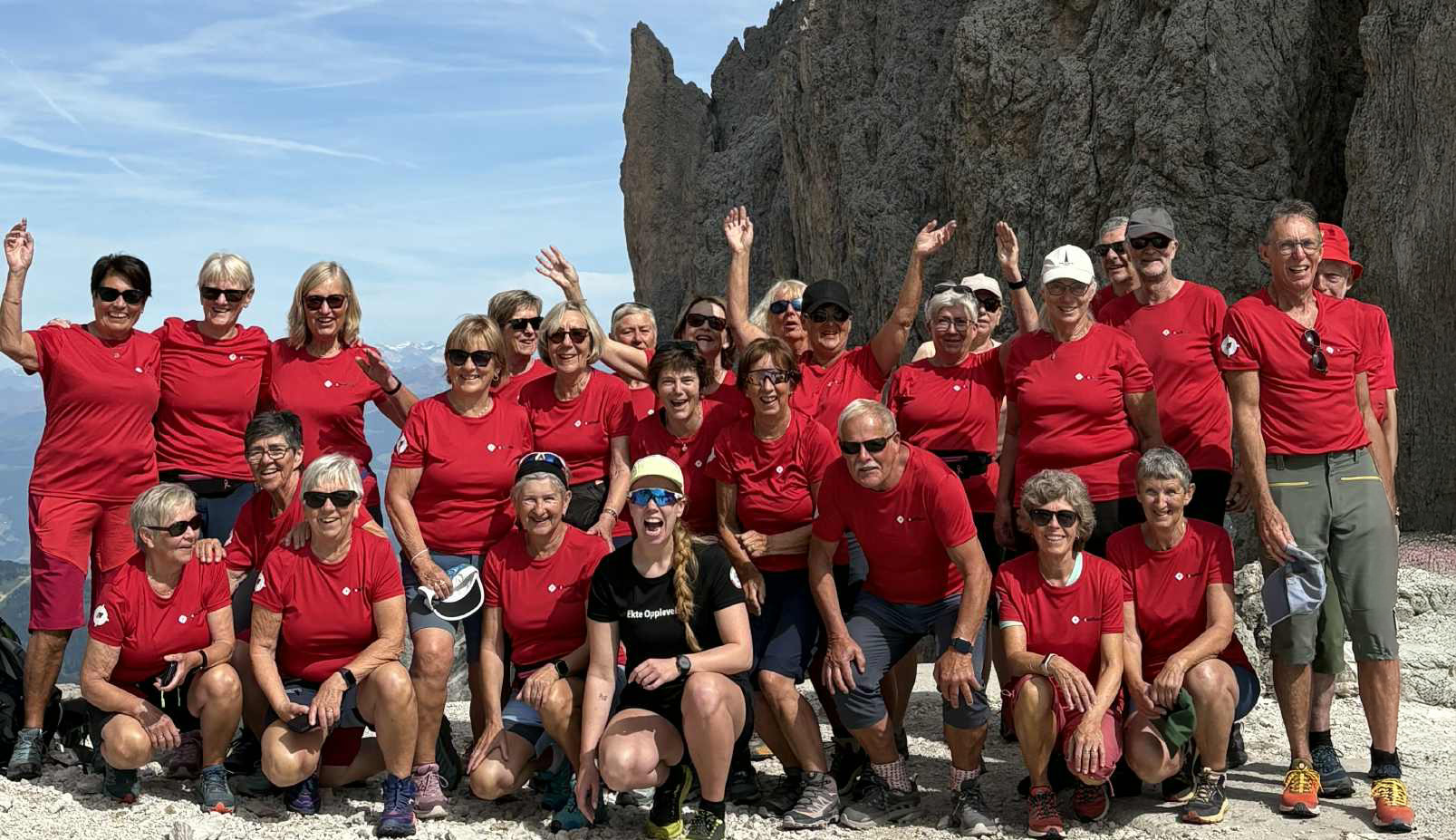 En herlig gjeng pensjonister i Dolomittene, ikledd like røde t-shirts med Expa-logo.