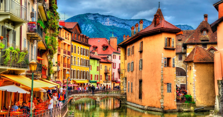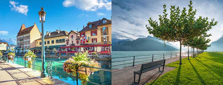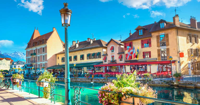 Byen Annecy, som ligger på den nordlige delen av Annecy-sjøen, kan minne om Venezia, med kanaler som går på tvers gjennom gamlebyen.