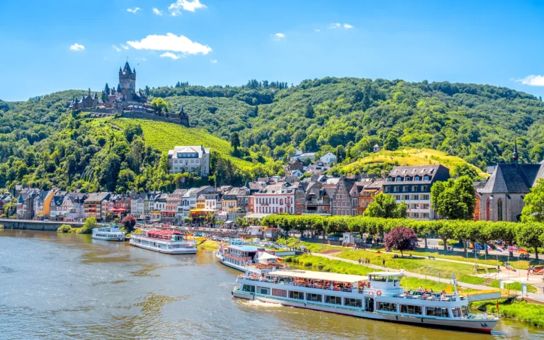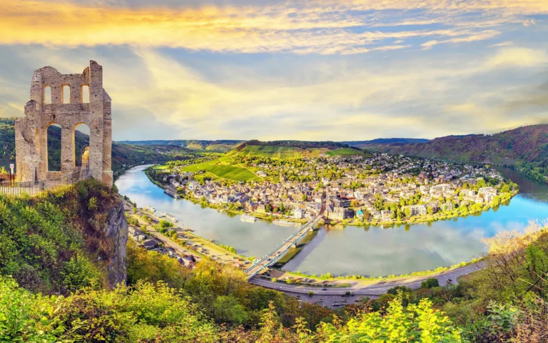 Fra Tysklands eldste by til Rhinens bredd – denne turen tar deg gjennom noen av Moseldalens mest stemningsfulle steder. Starten går i historiske Trier, med romerske ruiner, vinbarer i trivelige gater og fortellingen om Karl Marx. Derfra følger du elven inn i hjertet av vinområdene – til småbyer der Riesling er stolthet og livsgrunnlag. Piesport og Bernkastel-Kues byr på bindingsverkshus, lune torg og utsikt mot vinranker i bratte åssider. Videre venter Traben-Trarbach, en elegant kurby med jugendstil og vinsmaking på hvert hjørne. Ruten slynger seg gjennom den ikoniske Zeller Hamm, forbi middelalderslott og Europas bratteste vingård før du triller inn i Cochem – kjent for sin festning og det spektakulære Reichsburg som ruver over byen.
