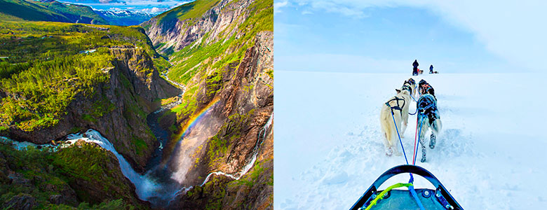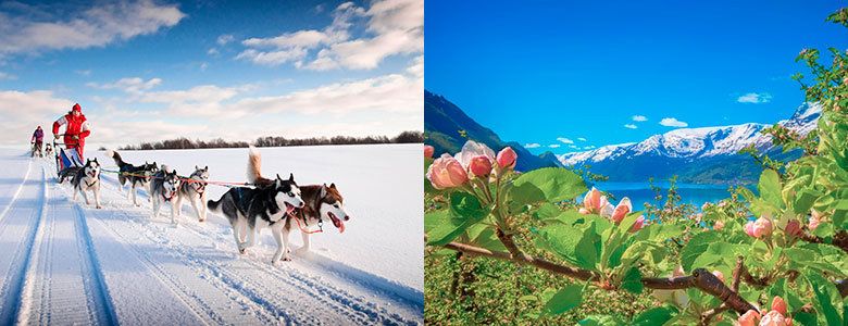 Opplev hardangerfjorden i blomstring og hundekjøring i vinterfjellet - på samme tur! / Foto: Shutterstock