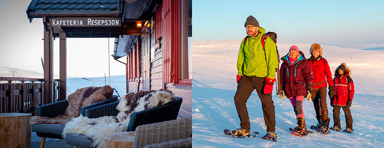 Etter middag er det tid for en liten kveldstur på truger for å oppleve det vakre lyset i fjellet.