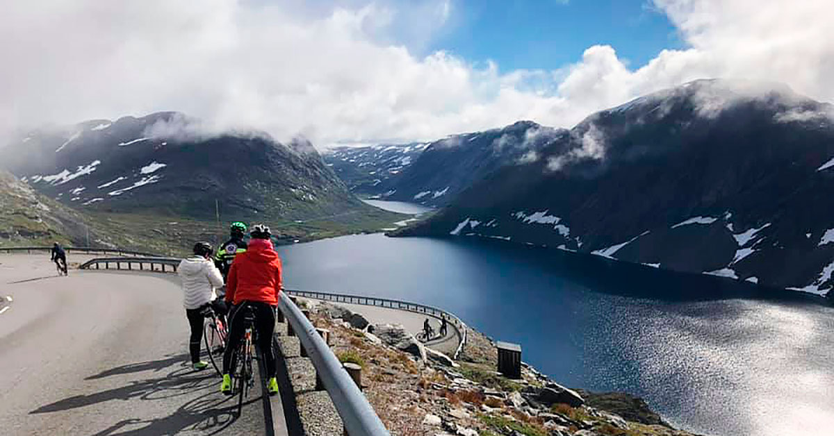Dagen starter relativt tidlig, med god frokostbuffet på hotellet. Deretter pakkes bagasjen i følgebilen før vi starter å sykle oppover ca. 20 kilometer!!! Her skal vi klatre ca. 1500 høydemeter helt opp til Dalsnibba, før resten av etappen stort sett går nedover hele veien til Lom. Fantastisk natur hele veien!